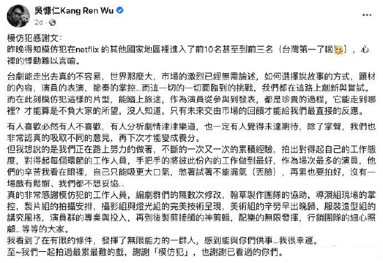 话说最近吴慷仁在社交平台上分享了一个超让人兴奋的消息!他主演的台剧《模仿犯》在Netflix上可真是火遍全球了,直接冲进了多个国家和地区的前十榜单,有些地方甚至窜到了前三名!